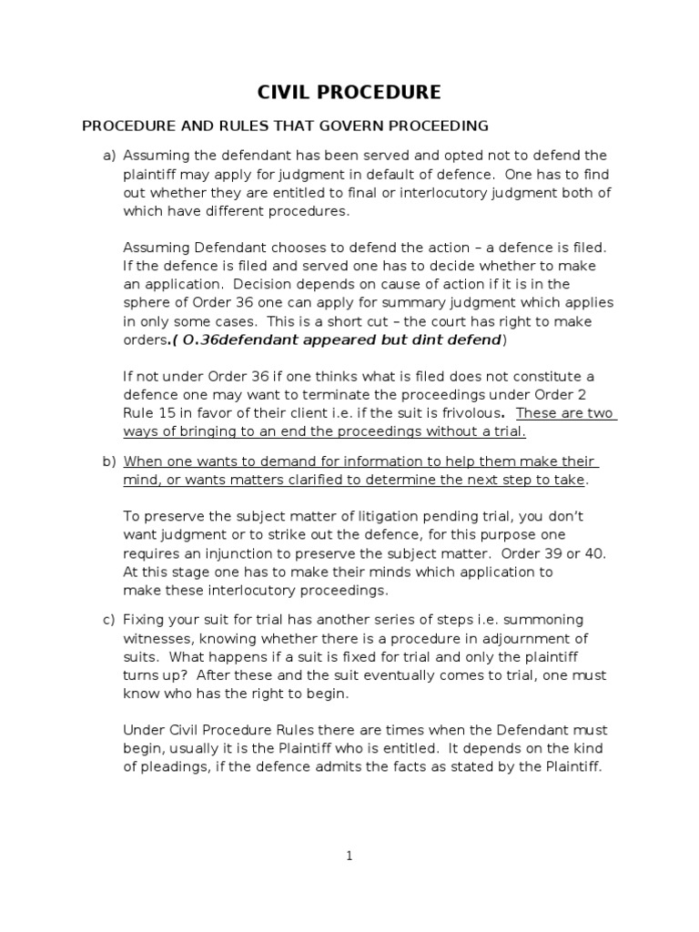 Notes in Civil Procedure - Rules 1-71 (Final) | Joinder ... from imgv2-1-f.scribdassets.com At its conclusion, a few years later, the ali/unidroit project was published as principles of transnational civil procedure (with the rules attached as a reporter's note) by cambridge. • the malaysian civil judicial system is based on common law. Procedures of civil cases preamble: Code of civil procedure is an adjective law. Lecture notes with cases on the civil procedure in malaysia. Notes on criminal procedure code by anish an 17388 views. Voluntary appearance, the court may proceed with the hearing and determination of the cause, but the judgment rendered therein shall not affect their rights or liabilities. Chamber of advocates law firmknygos ir nuorodos.