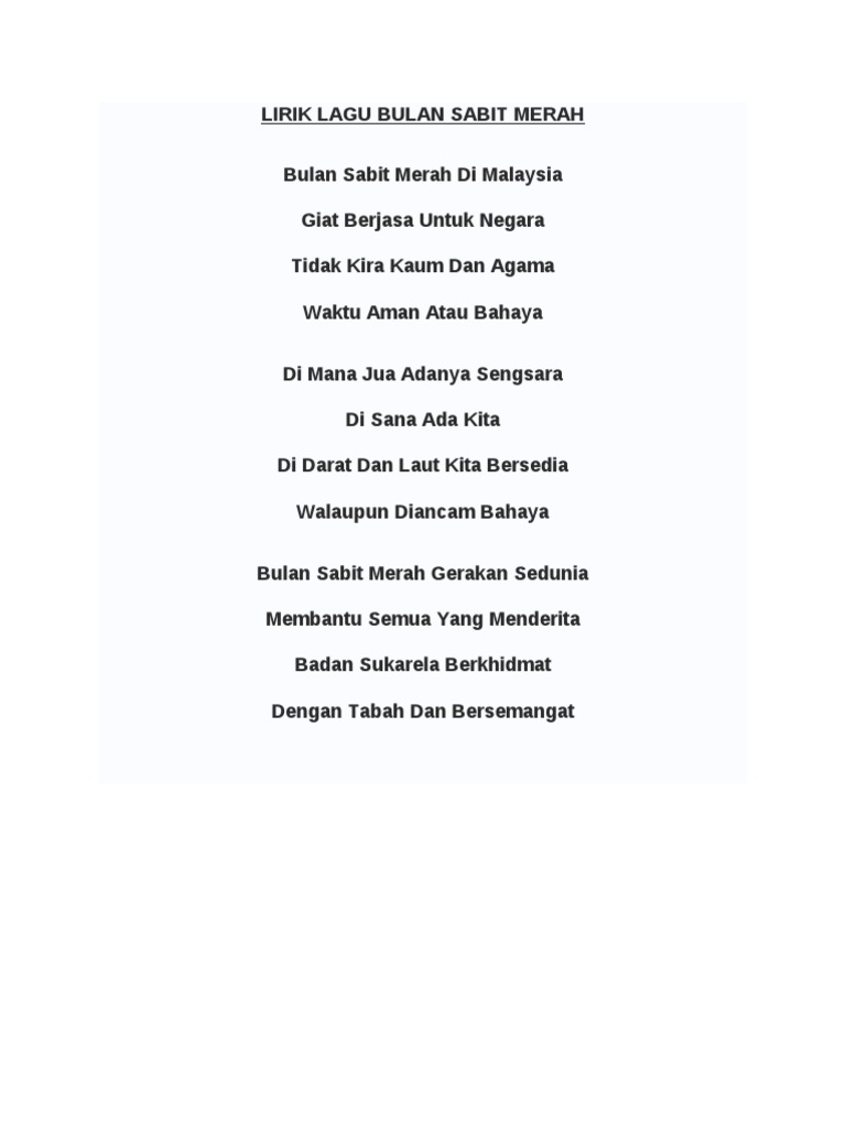 50%(6)50% found this document useful (6 votes). Lagu rasmi bulan sabit merah malaysia. Lagu persatuan bulan sabit merah malaysia. Savesave lirik lagu bulan sabit merah di malaysia for later. Persatuan ini diiktiraf kerajaan malaysia pada tahun 1957 dan persatuan palang merah antarabangsa pada tahun 1963.